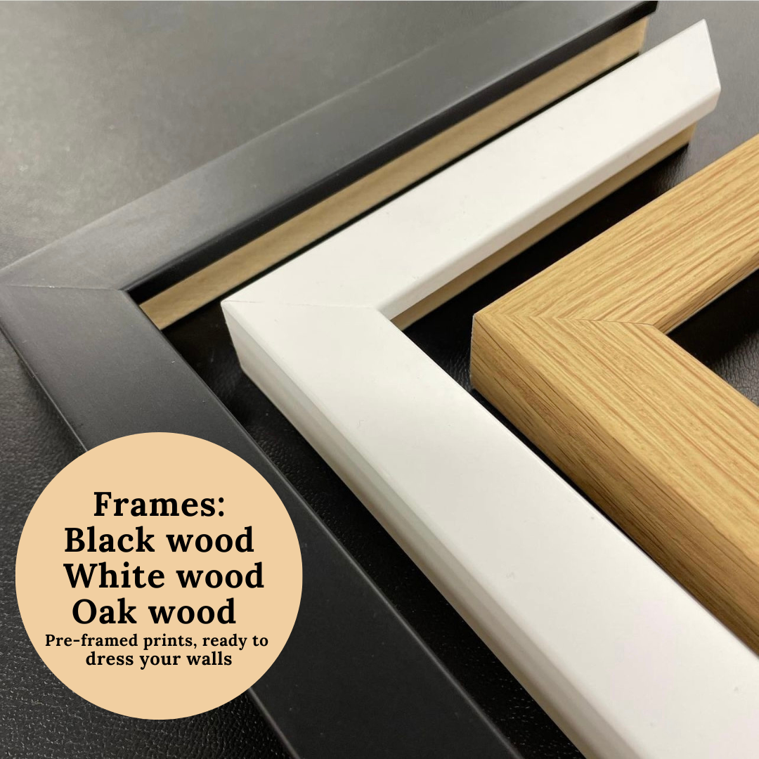 All prints are printed on fine art Giclee 230gsm with a smooth matt finish for the highest of quality and are now available to purchase pre-framed and ready to dress your walls! Choose between three frame options: Black wood, White wood and Natural oak wood. You can also still purchase the prints Unframed.